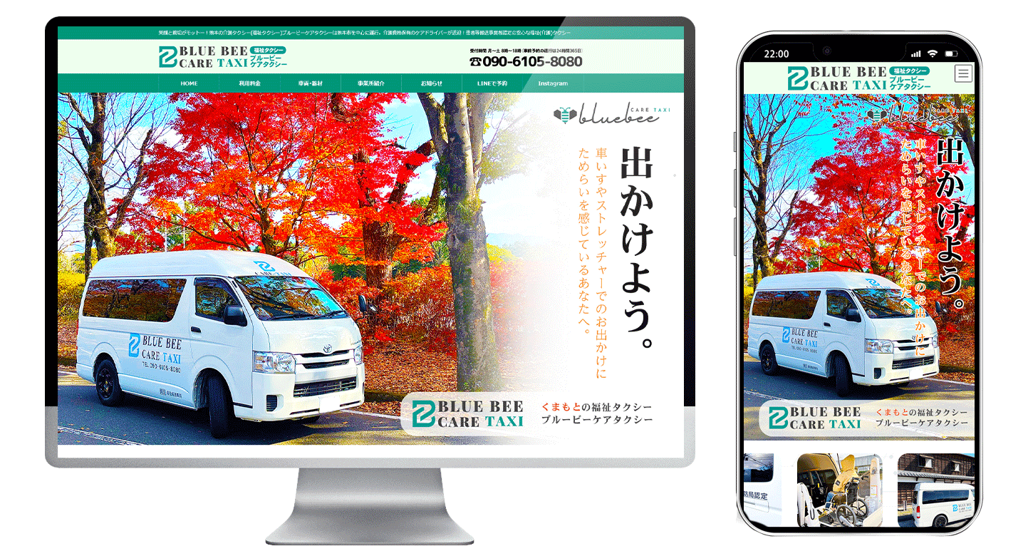 福祉タクシー(介護タクシー)ブルービーケアタクシー様のサイトを新規制作させていただきました。介護資格を持つプロのドライバーが病院やちょっとした移動阿蘇などの観光地も目的地まで安心・安全に送迎いたします。