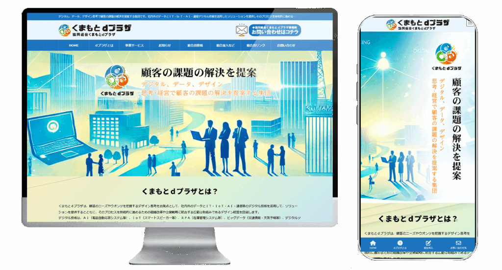 熊本県八代市の協同組合くまもとdプラザ 様のホームページを制作させていただきました、ありがとうございます。今回新規のホームページの制作をさせていただきました。組合様の業務内容がデジタル、データ、デザイン思考・経営で顧客の課題の解決を提案するサービスとの事で、お写真などはAIなどを使用して組合様から提供いただきました。AIを駆使してロゴなども提供いただき、最新技術を取り入れられている組合様です。今回イメージカラーの青をベースとしアクセントにロゴ色の緑やオレンジを入れてさせていただきデザインをさせていただきました。