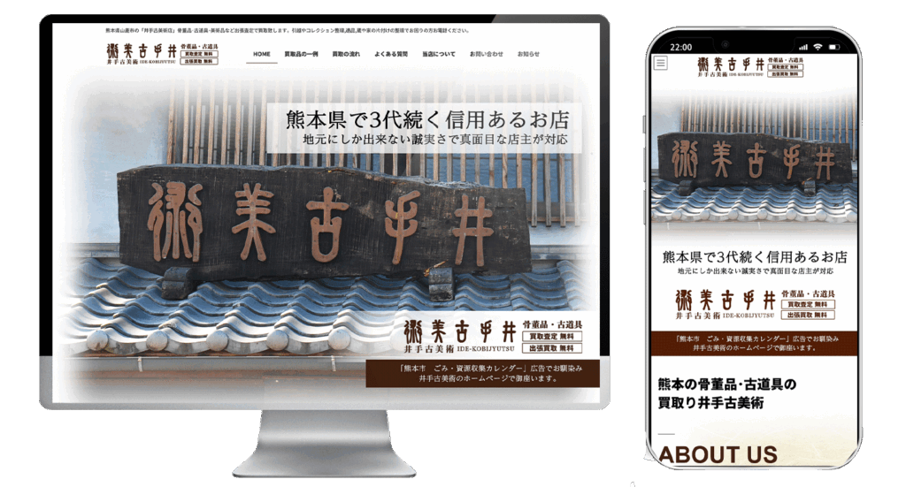 熊本県山鹿市の井手古美術店様のホームページをリニューアルさせていただきました、ありがとうございます。10年ほど前に制作したホームページを最新規格のデザインでワードプレスを使ったホームページへリニューアルさせていただきました。