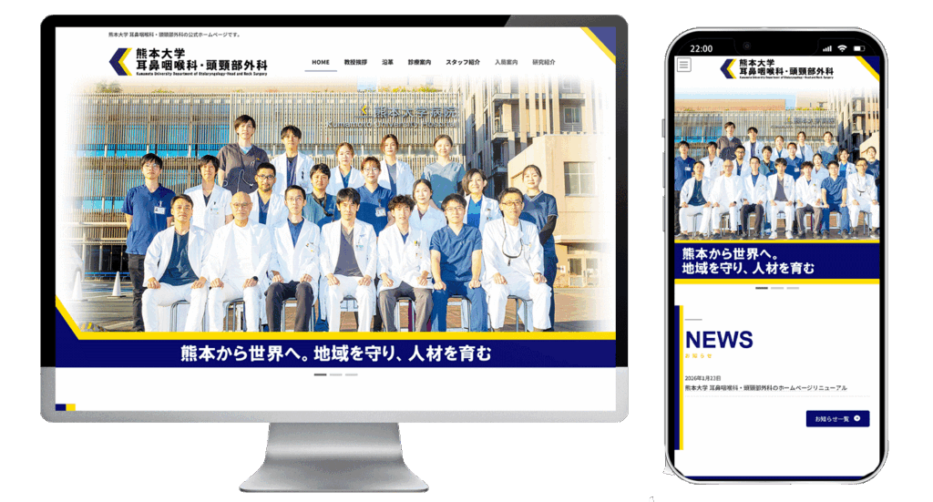 熊本大学病院の熊本大学医学部附属病院外来受付耳鼻咽喉科・頭頸部外科のホームページをリニューアルさせていただきました。今回、旧サイトを最新の規格のデザインに変更させていただき、ワードプレスを使ったホームページへリニューアルさせていただきました。レスポンシブデザインなのでパソコン・タブレット・スマホなどの端末でも表示され、スマホでも内容省略されることなく作成させて頂きました。